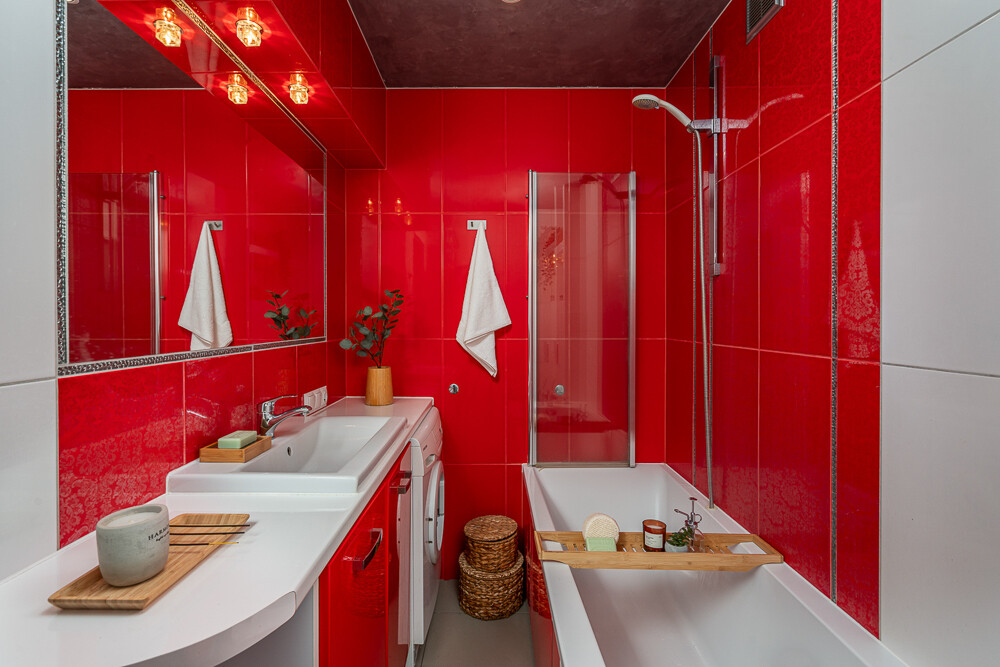 Mocny, czerwony kolor został stonowany dzięki drewnianym dodatkom i zielonym akcentom.